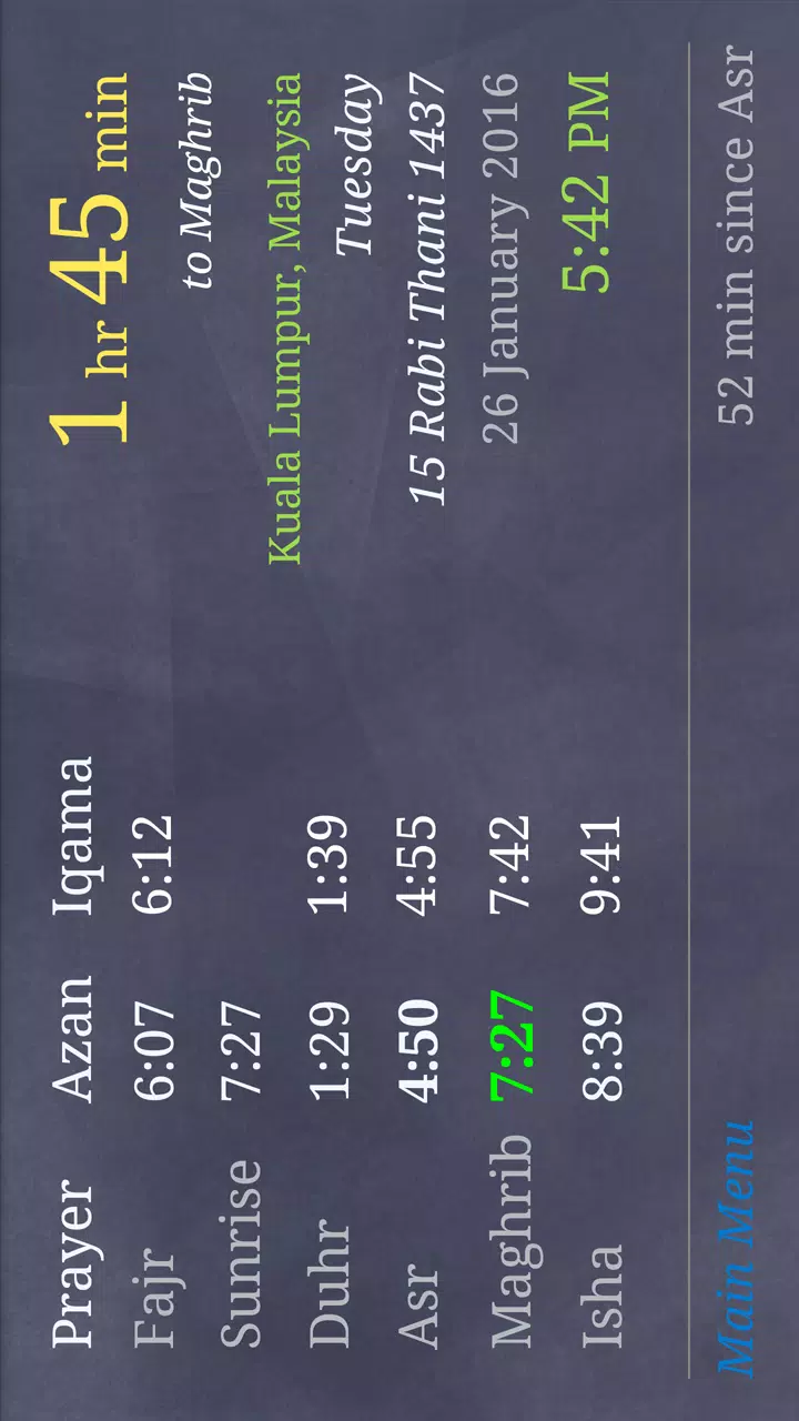 Prayer Times Today. 33 rows Prayer Times Today. Waktu solat Islam yang paling tepat di Kuala Lumpur Kuala Lumpur Malaysia Waktu Fajar hari ini 0551 AM Waktu Zohor 0102 PM Waktu Asar 0415 PM Waktu Maghrib 0704 PM Waktu.